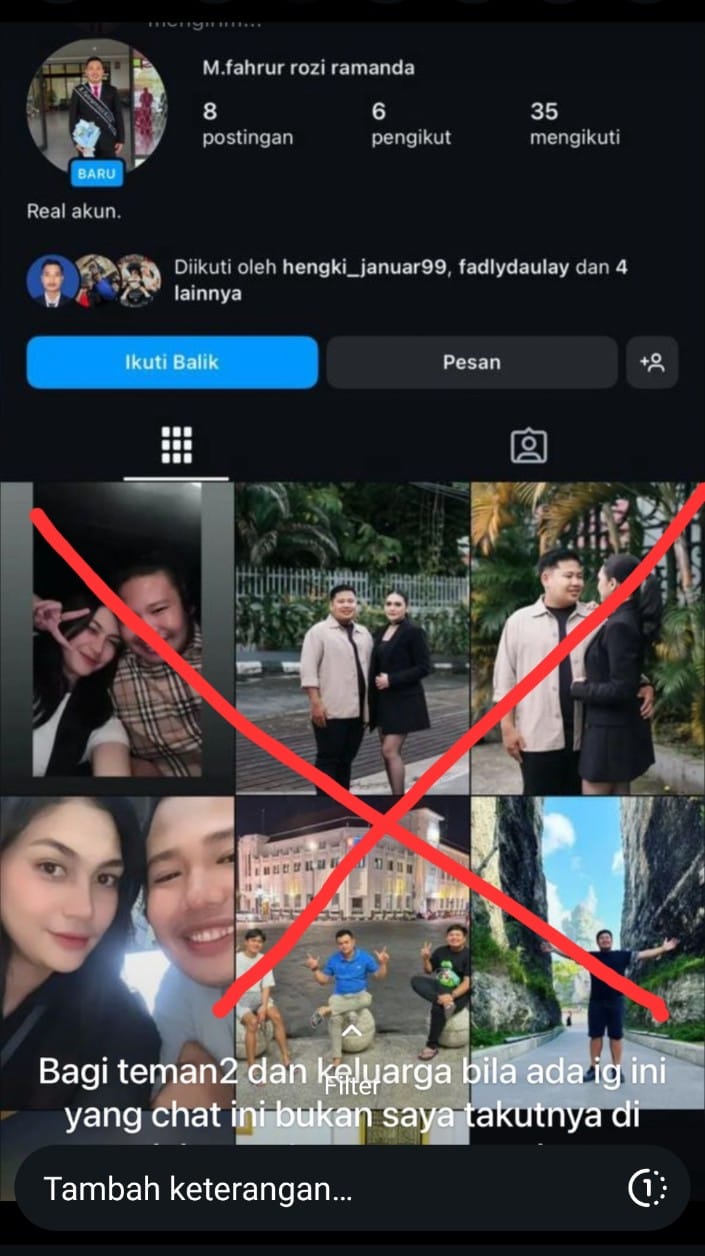 Melawi Kalbar,Komposisinews.com -Telah beredar akun Instagram palsu menggunakan nama M.Fahrurozi ramanda januardi serta Poto profil yang menggunakan potonya.. Akun ini tentu saja sengaja dibuat oleh oknum yang tidak bertanggungjawab dengan tujuan tertentu. Sehingga diminta kepada warga masyarakat serta pengguna akun Instagram dan media sosial lainnya untuk tidak mempercayai akun tersebut.