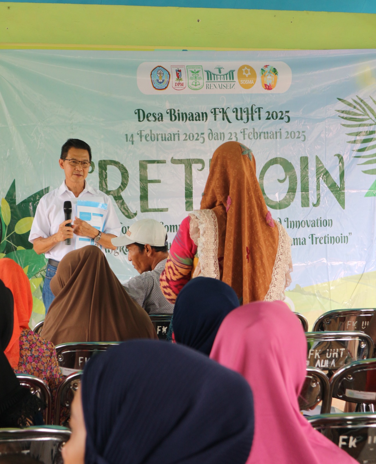 Wakil Dekan 3 Fakultas Kedokteran UHT, dr. Risma, M.Si., dalam sambutannya mengapresiasi dan mengucapkan terima kasih kepada seluruh pihak yang telah berkontribusi dalam penyelenggaraan acara ini. “Dengan mengusung tema TRETINOIN (Transforming Communities With Care and Innovation), kegiatan ini tidak hanya bertujuan untuk memberikan layanan kesehatan, tetapi juga menanamkan nilai edukasi dan inovasi kepada masyarakat agar lebih sadar akan pentingnya menjaga kesehatan dan kesejahteraan,” ungkapnya.