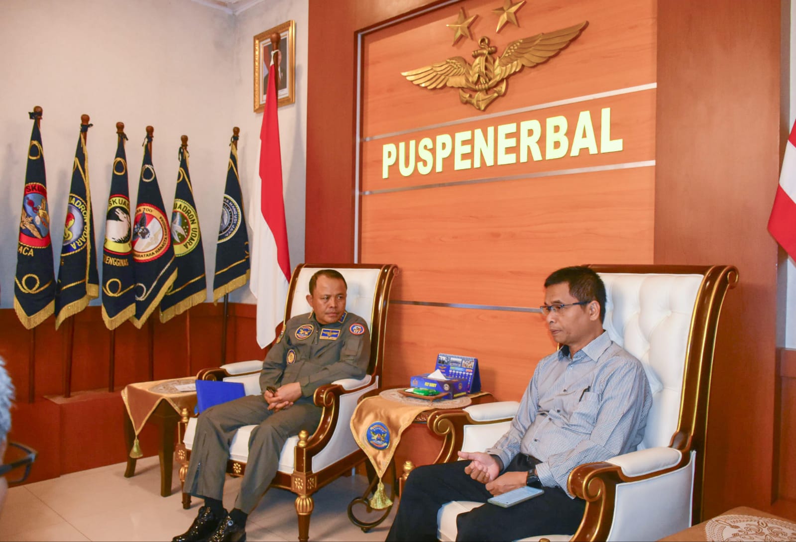 Sementara itu Komandan Puspenerbal dalam menerima tamunya tersebut didampingi Wakil Komandan Puspenerbal, Laksma TNl Bayu Alisyahbana, Inspektur Puspenerbal, Dirrenbang Puspenerbal, Dirops Puspenerbal, Dirpers Puspenerbal, Dirlog Puspenerbal, Dirlambangja Puspenerbal, serta para komandan satuan, seperti Danwing Udara 2, Danlanudal Juanda, dan Dankolat Penerbal.