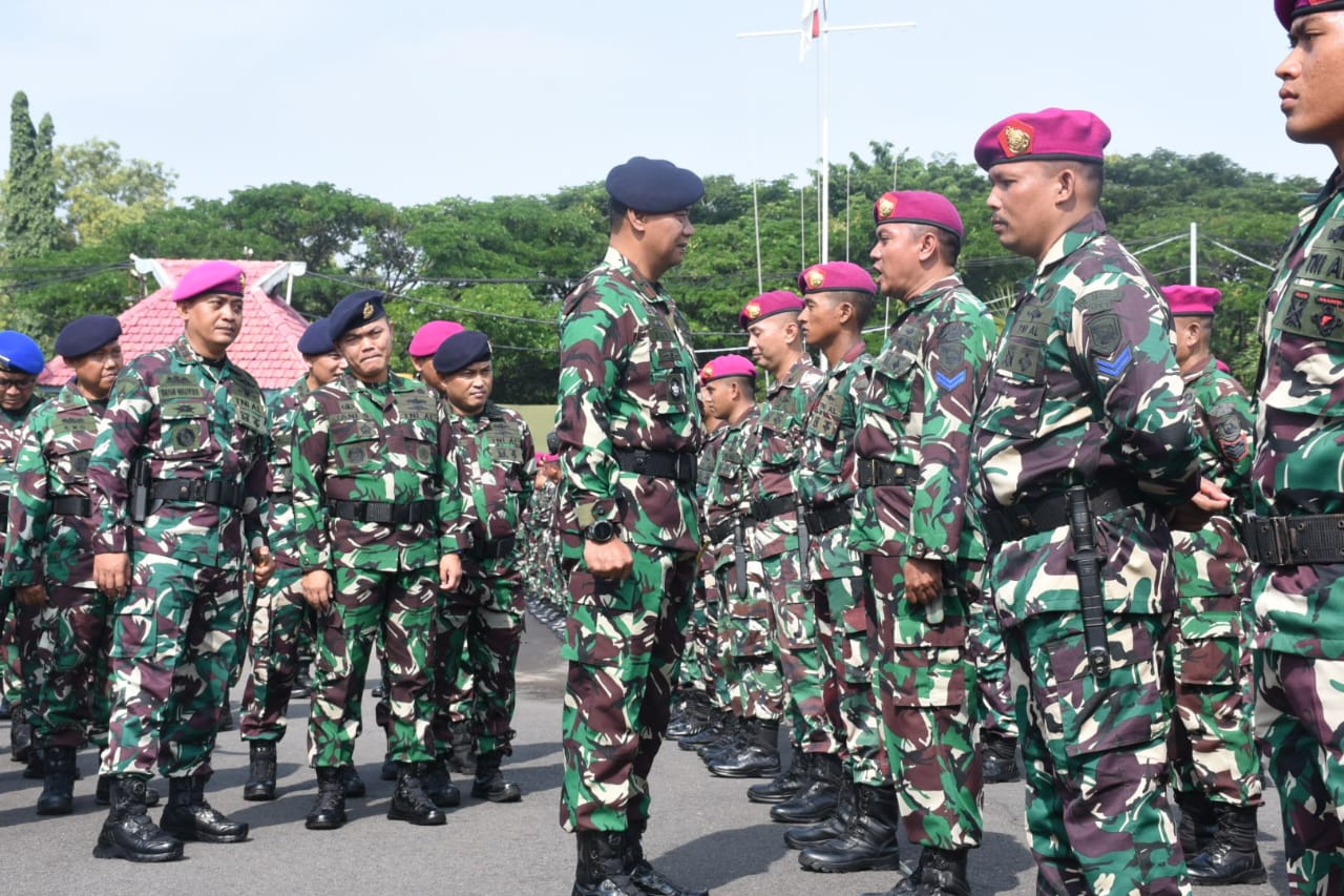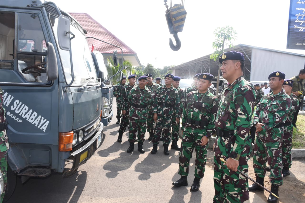 Setelah apel siaga bencana Danlantamal V menyempatkan melaksanakan pemeriksaan pasukan dan kesiapan kendaraan serta peralatan yang digunakan didampingi Wadan Lantamal V, Asisten Danlanlamal V serta Kasatker/Dansatlak Lantamal V. (Arifin)