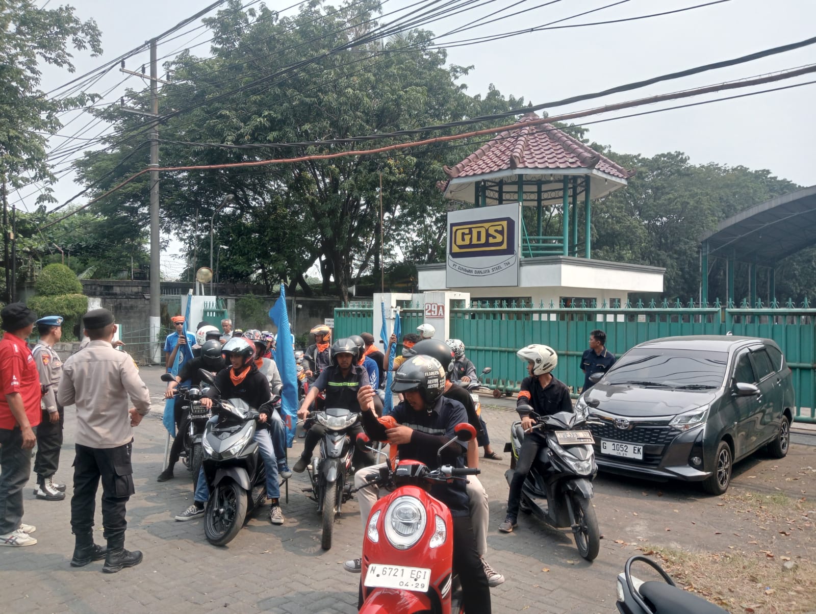 Polres Pelabuhan Tanjung Perak melakukan pengawalan di PT GDS tempat berkumpulnya massa buruh PUK GDS dan SPSI LEM.