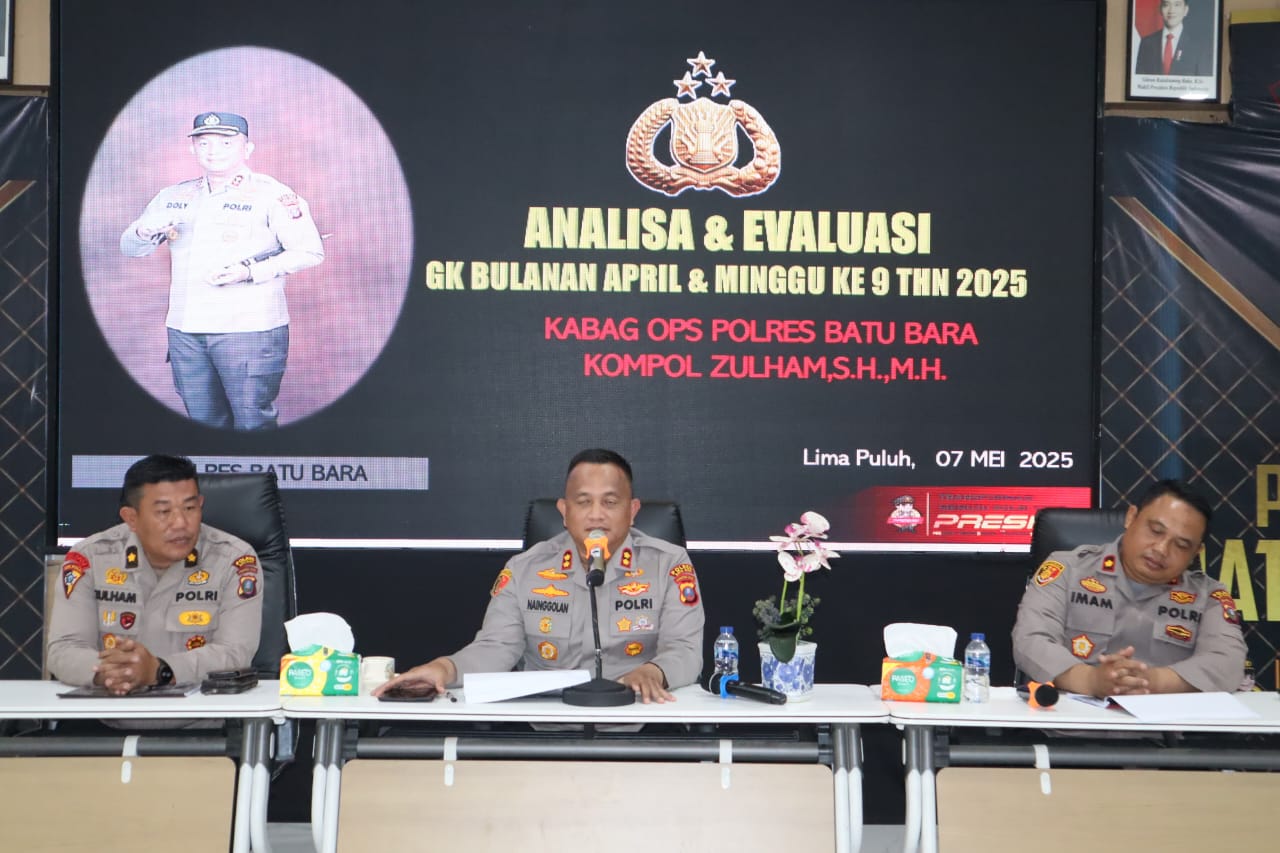 Batu Bara,Komposisinews.com – Polres Batu Bara menggelar kegiatan Analisa dan Evaluasi (Anev) Mingguan Gangguan Kamtibmas dan Kinerja Personil di Aula Sarja Arya Racana Polres Batu Bara pada Rabu, 7 Mei 2025, Jam 09:00 wib.