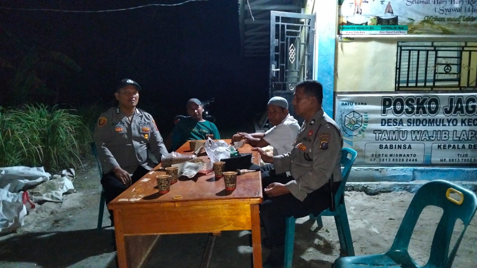 Kepala Desa Sidomulyo mengucapkan terima kasih kepada personil Polsek Medang Deras yang telah hadir di pos kamling untuk memberikan pesan kamtibmas. Kegiatan ini dipimpin oleh Kapolsek Medang Deras, AKP A. H. Sagala.