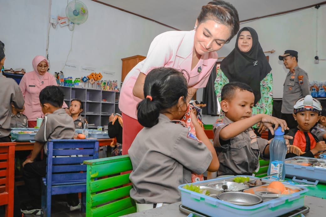 Ngawi,Komposisinews.com– Kapolres Ngawi AKBP Charles Pandapotan Tampubolon bersama Ketua Pengurus Yayasan Kemala Bhayangkari (YKB) Cabang Ngawi Ny. Patricia Charles T, berbagi makanan bergizi dan susu gratis di TK Kemala Bhayangkari 57 Sine.