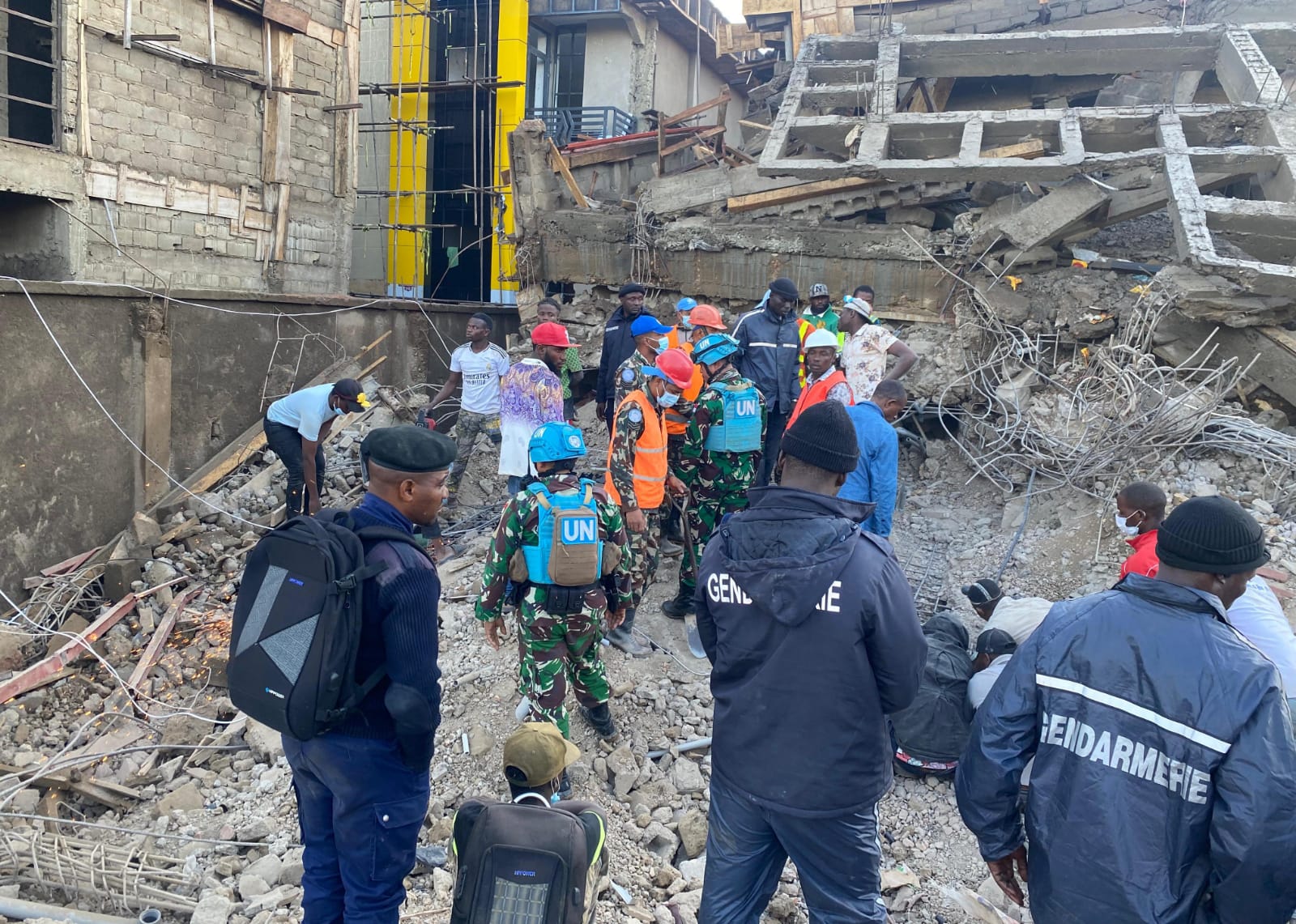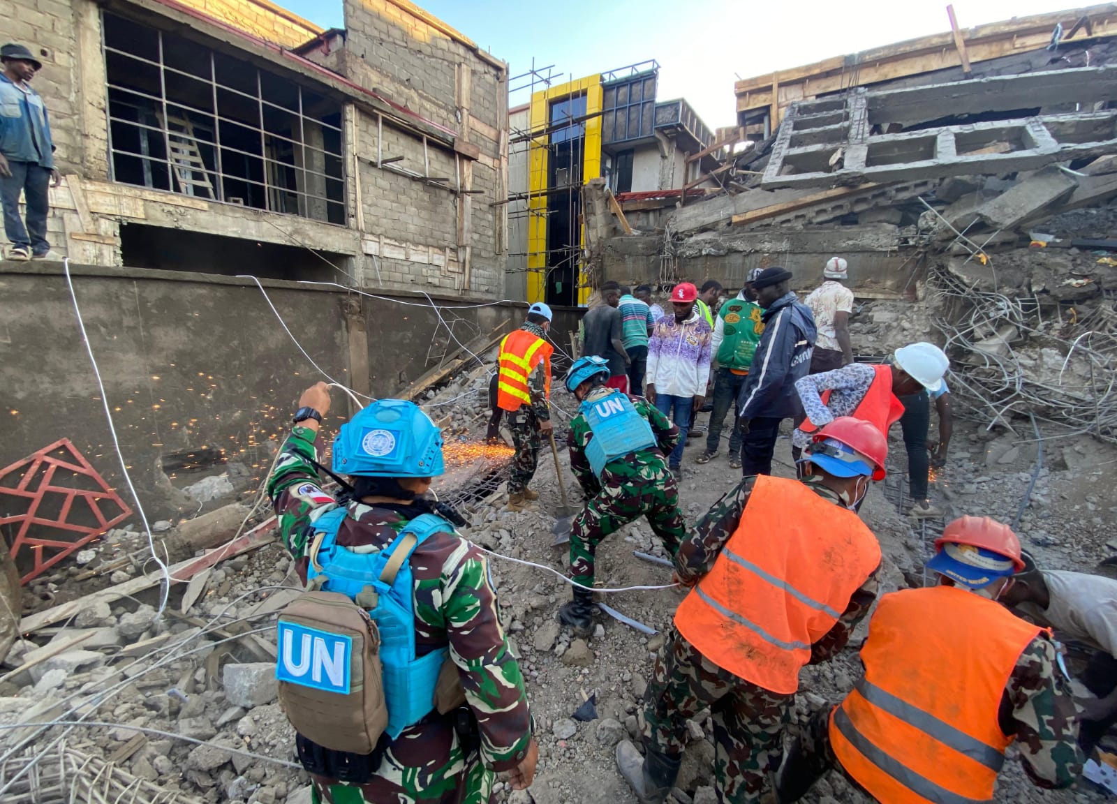 Pasukan Satgas BGC 39-F Monusco Yang berada di “Ndromo Super Camp” segera membentuk Tim evakuasi dan langsung melaksanakan operasi pencarian dan penyelamatan terhadap korban yang tertimpa reruntuhan. Hingga saat ini, tiga orang telah berhasil dievakuasi, namun dengan penuh duka disampaikan bahwa dua di antaranya dinyatakan meninggal dunia akibat tertimpa material bangunan.