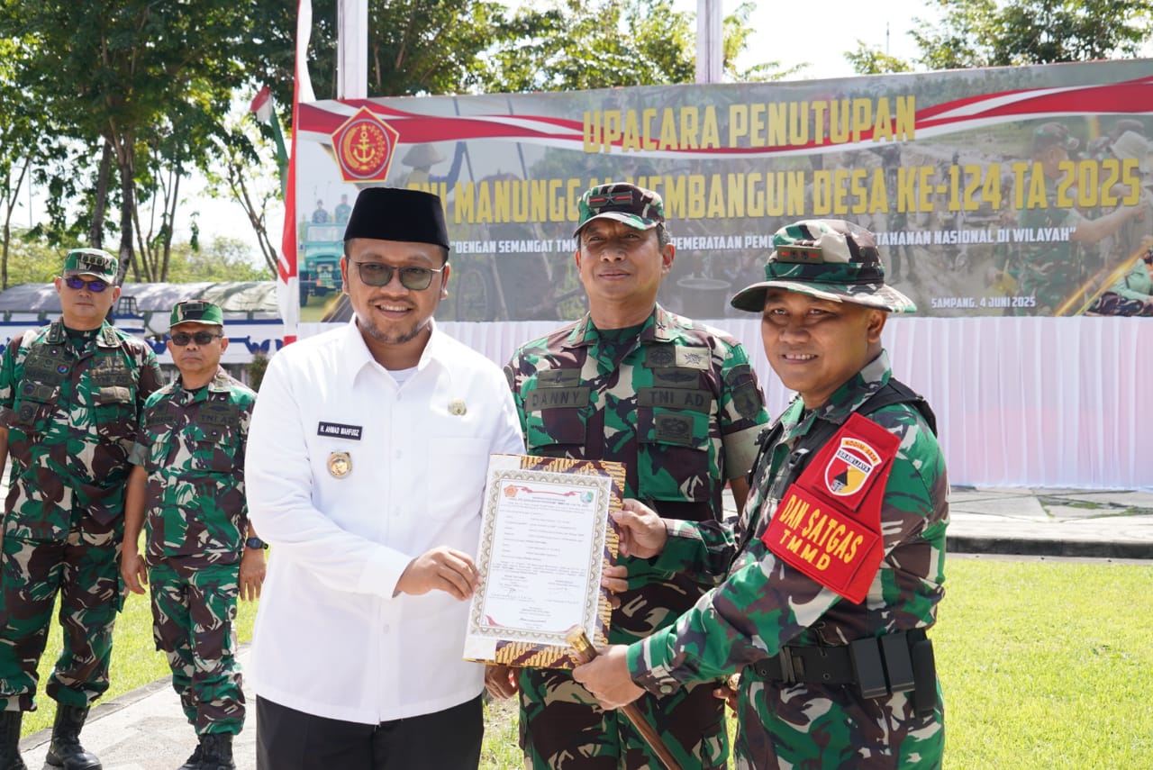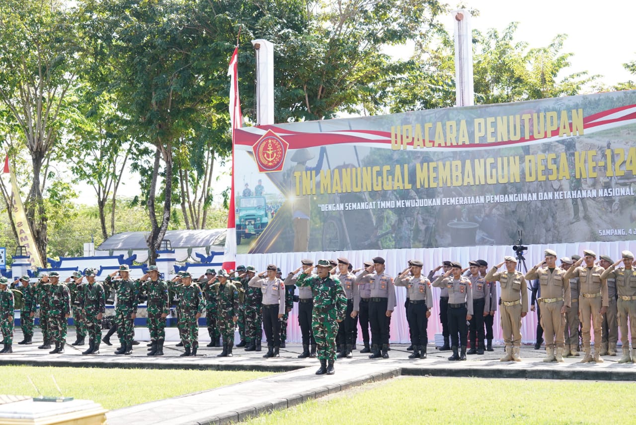 Sampang,Komposisinews.com — Program TNI Manunggal Membangun Desa (TMMD) ke-124 Tahun 2025 secara resmi ditutup oleh Komandan Korem 084/Bhaskara Jaya, Brigjen TNI Danny Alkadrie, dalam sebuah upacara khidmat yang digelar di Pendopo Kabupaten Sampang. Penutupan ini menandai berakhirnya rangkaian kegiatan pembangunan fisik dan non-fisik yang telah dilaksanakan selama satu bulan penuh di wilayah pedesaan Kabupaten Sampang.
