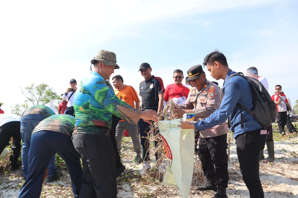 Para peserta apel, yang terdiri dari aparat kepolisian, pejabat daerah, dan masyarakat sekitar, bahu-membahu membersihkan sampah yang berserakan di Pantai Belacan.