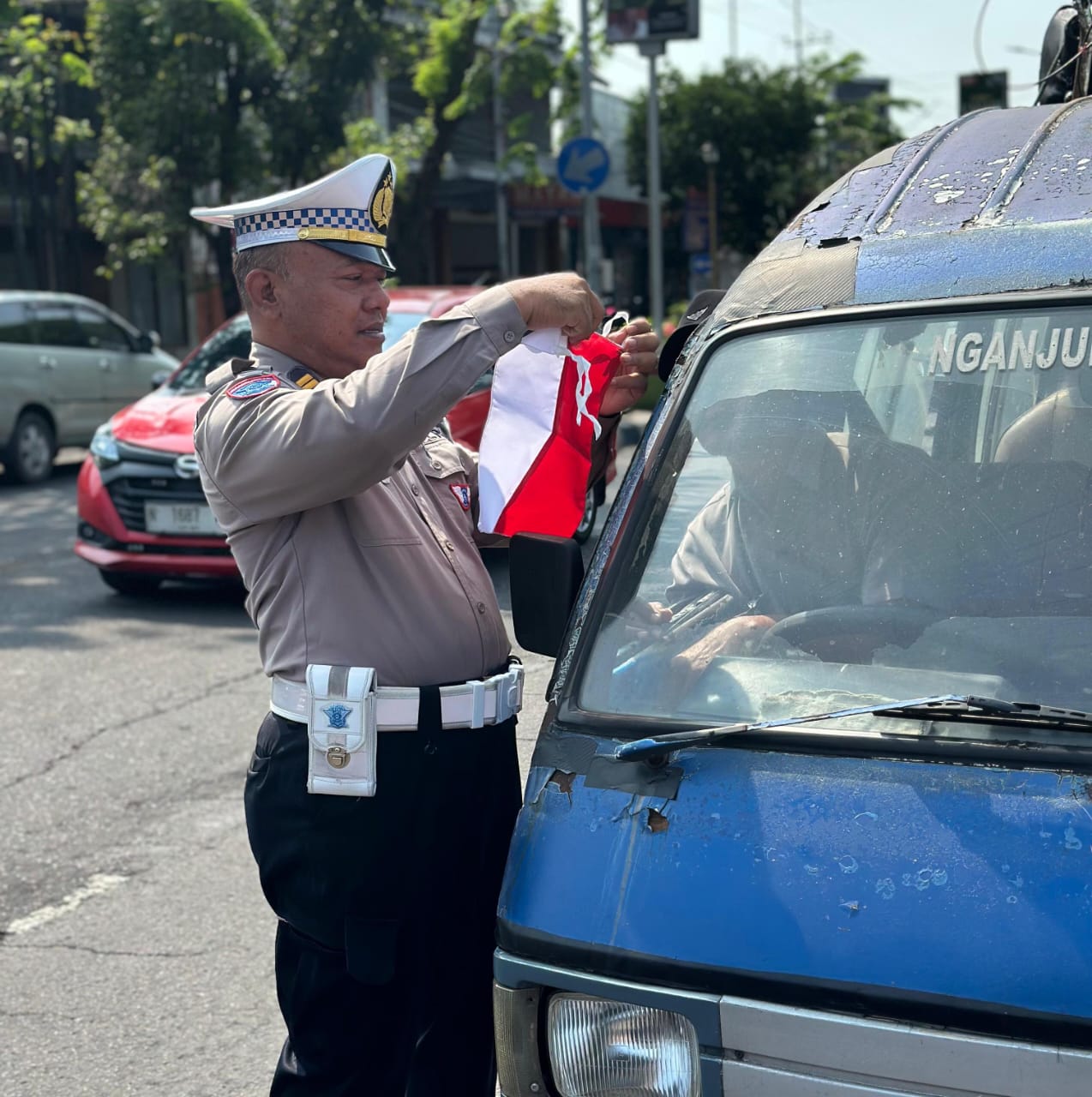 Nganjuk,Komposisinews.com – Gugah semangat nasionalisme, Polres Nganjuk Polda Jatim melalui Satuan Lalu Lintas membagikan bendera Merah Putih kepada pengemudi truk, angkutan umum, dan pengendara roda dua (R2) yang melintas di Jalan Panglima Sudirman serta depan Pos Lantas Pujahito.