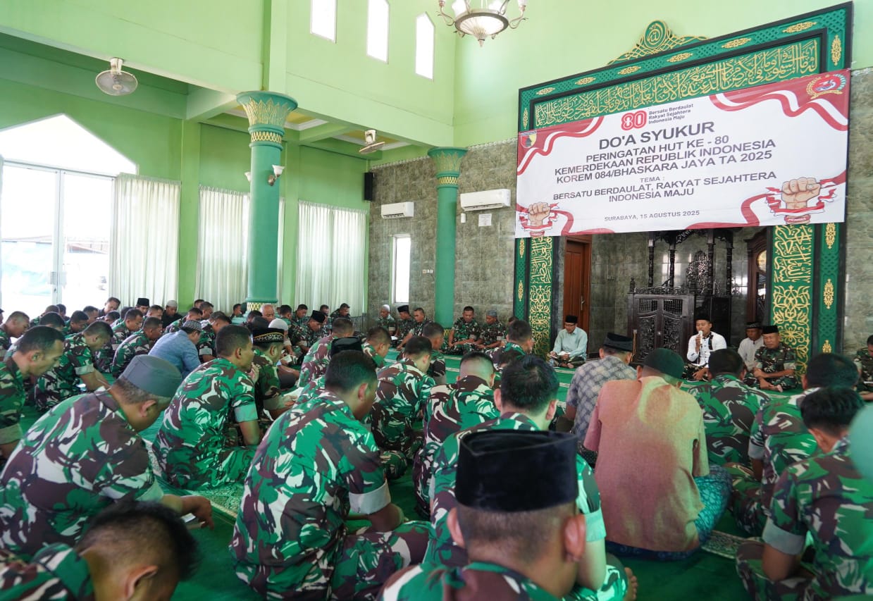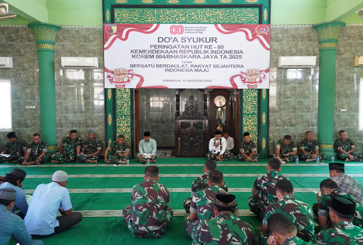 Surabaya,Komposisinews.com – Dalam rangka memperingati Hari Ulang Tahun ke-80 Kemerdekaan Republik Indonesia, Korem 084/Bhaskara Jaya menggelar doa syukur di Masjid Al Wathon, Makorem 084/BJ, Jumat (15/8/2025). Kegiatan ini dihadiri oleh Kasrem 084/BJ, para Kasi, para Pasi, seluruh prajurit TNI, dan PNS Korem 084/BJ.
