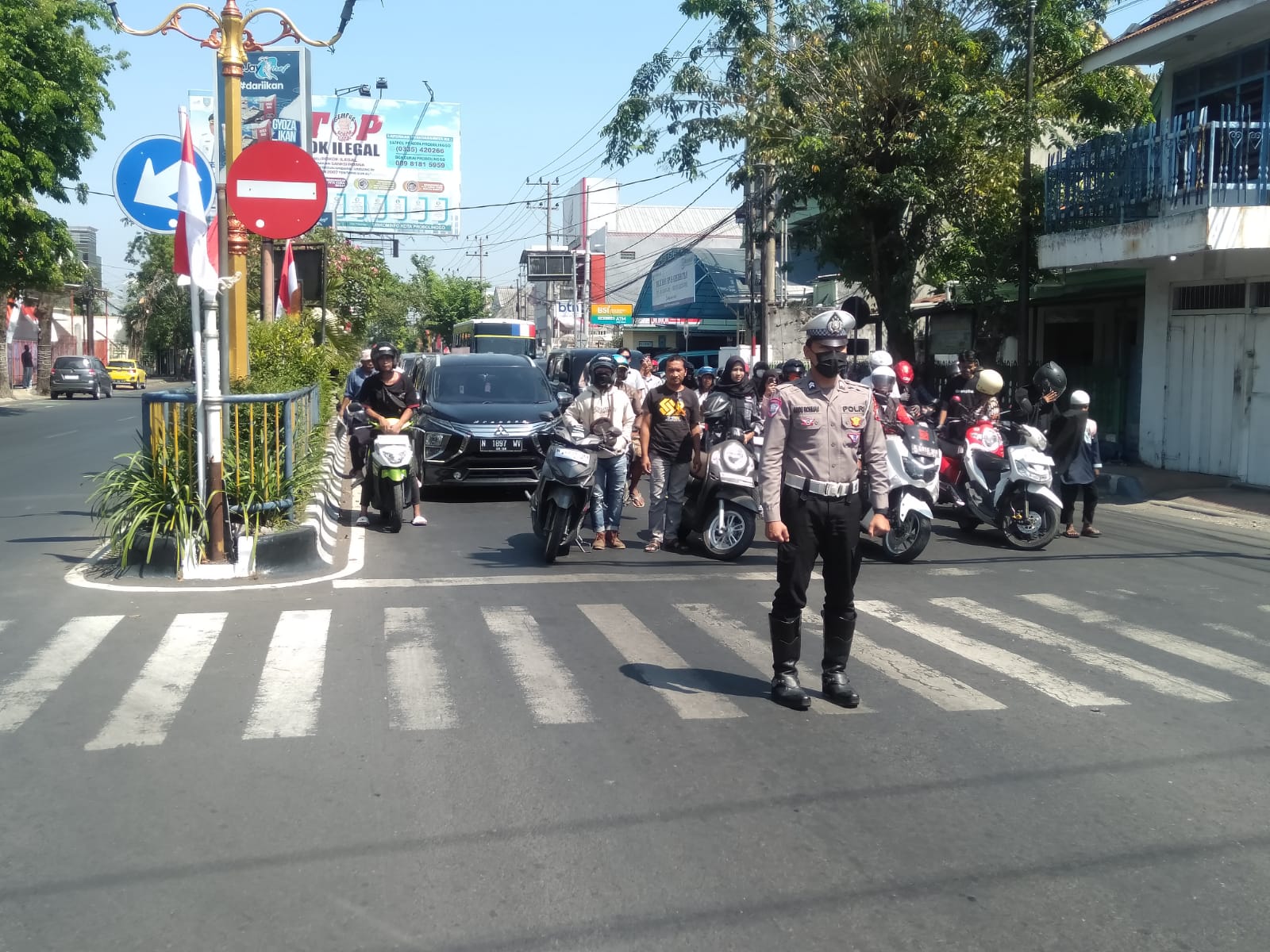 Setelah selesai memberikan penghormatan, para pengendara yang berada di persimpangan brak diizinkan untuk melanjutkan perjalanannya kembali dengan dibantu oleh arahan petugas Satlantas Polres Probolinggo kota