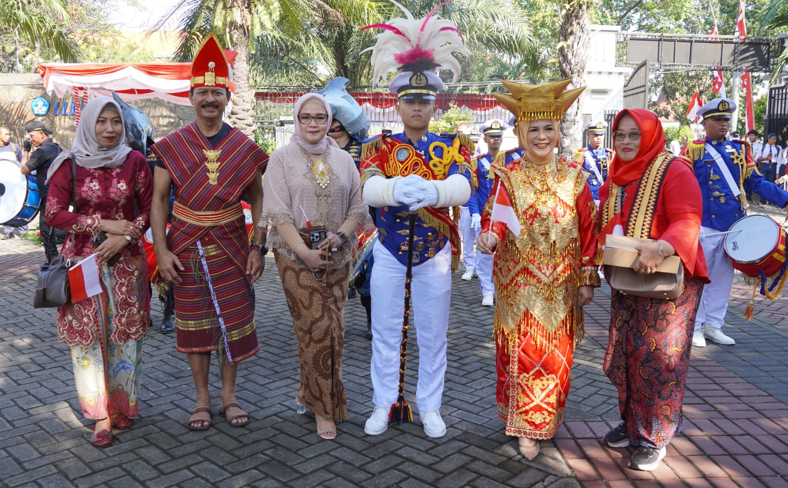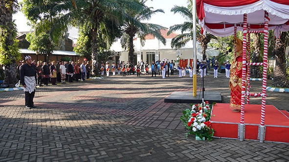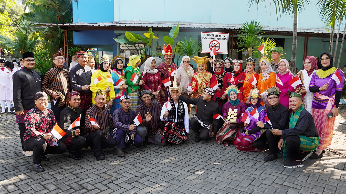 Kepala LLDIKTI Wilayah VII, Prof. Dr. Dyah Sawitri, S.E., M.M., tampil anggun mengenakan pakaian adat Minangkabau saat membacakan naskah Proklamasi Kemerdekaan RI. Rangkaian acara berlanjut dengan penyematan tanda kehormatan Satyalancana Karya Satya kepada 28 PNS dengan masa kerja 30 tahun dan 10 PNS dengan masa kerja 10 tahun, serta penyerahan bantuan dana pendidikan kepada siswa SD, SMP, dan SMA.