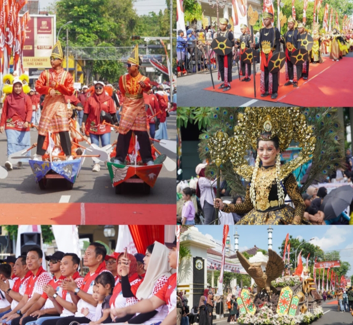 Mengambil rute, Depan Pendopo – Jl. Lamongrejo Jl. Wahidin SH-JI. Soewoko JI. KH. Ahmad Dahlan – Jl. Sunan Drajad – Jalan Sumargo – sampai Lapangan Gajah Mada, masyarakat tumpah ruah menyaksikan parade penuh warna. Busana adat, marching band, tarian tradisional, replika bangunan dan karakter, hingga cosplay modern berpadu menjadi gambaran nyata keberagaman Indonesia.