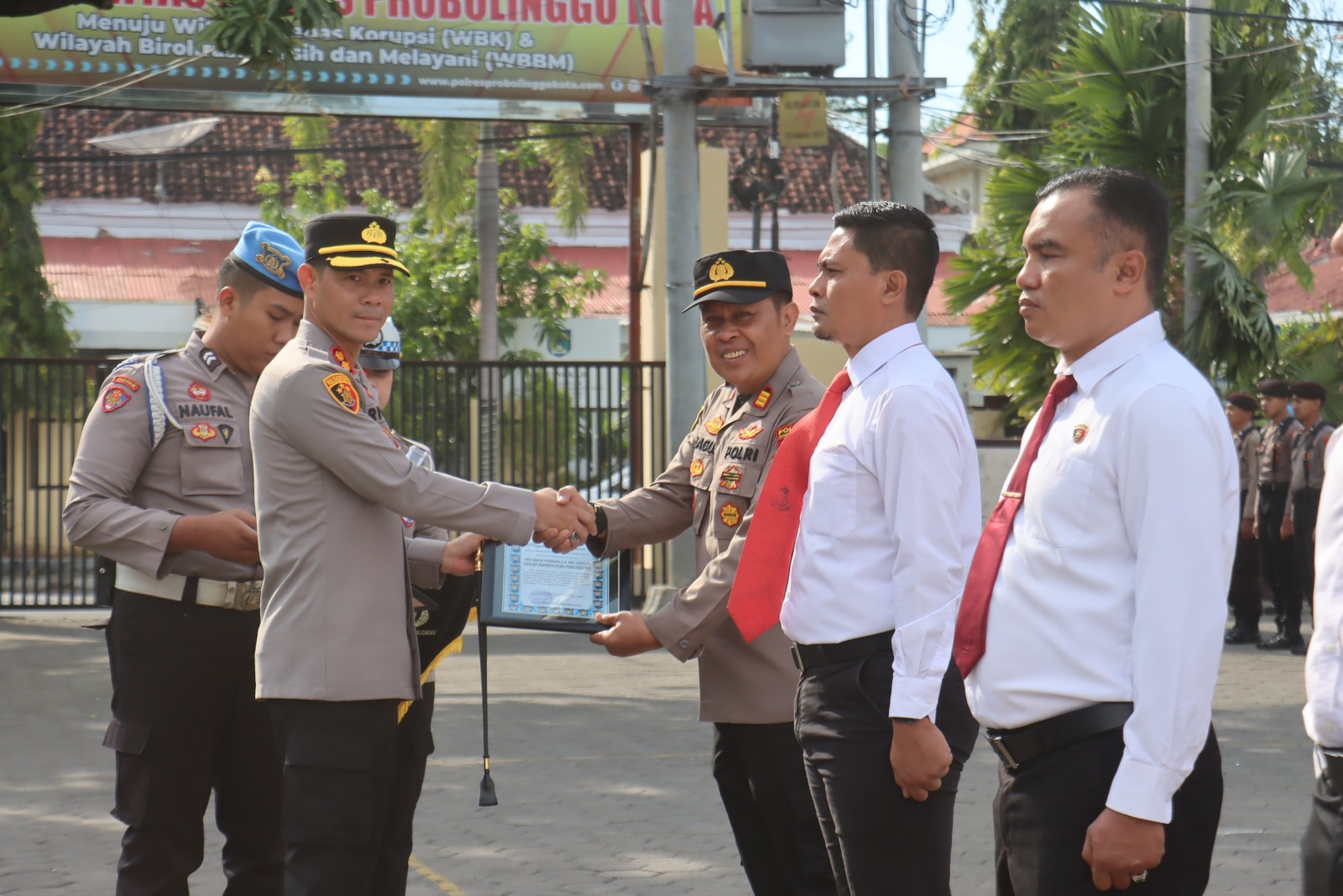 Kapolres mengucapkan selamat kepada anggota Polri yang telah menerima Reward dan juga terima kasih yang sebesar-besarnya kepada Sdr. Sunarto atas peran aktif serta jasanya dalam membantu tugas Polri khususnya di Polres Probolinggo Kota.