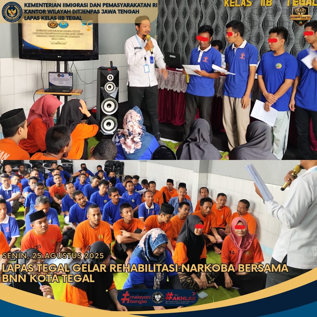 Tegal,Komposisinews.com – 25 Agustus 2025 – Lembaga Pemasyarakatan Kelas IIB Tegal berkolaborasi dengan Badan Narkotika Nasional (BNN) Kota Tegal laksanakan salah satu 13 Akselerasi program Menteri Imigrasi dan Pemasyarakatan yaitu rehabilitasi narkotika bagi warga binaan. Kegiatan ini bertujuan untuk memulihkan para warga binaan dari ketergantungan dan mempersiapkan mereka kembali ke masyarakat sebagai individu yang produktif dan bebas dari narkoba.