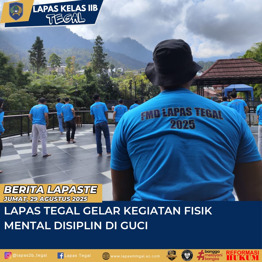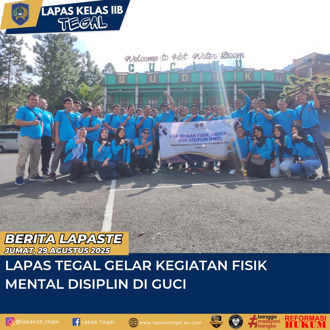 Tegal,Komposisinews.com – 29 Agustus 2025 – Lapas Tegal gelar kegiatan FMD (Fisik Mental Disiplin) yang dilaksanakan di kawasan Guci. Kegiatan ini diikuti oleh seluruh jajaran pegawai Lapas Teg. Kepala Lapas Tegal, Haryono, memimpin langsung kegiatan ini sebagai bentuk dukungan dan motivasi kepada seluruh petugas agar tetap menjaga semangat, fisik, dan disiplin dalam menjalankan tugas sehari-hari.