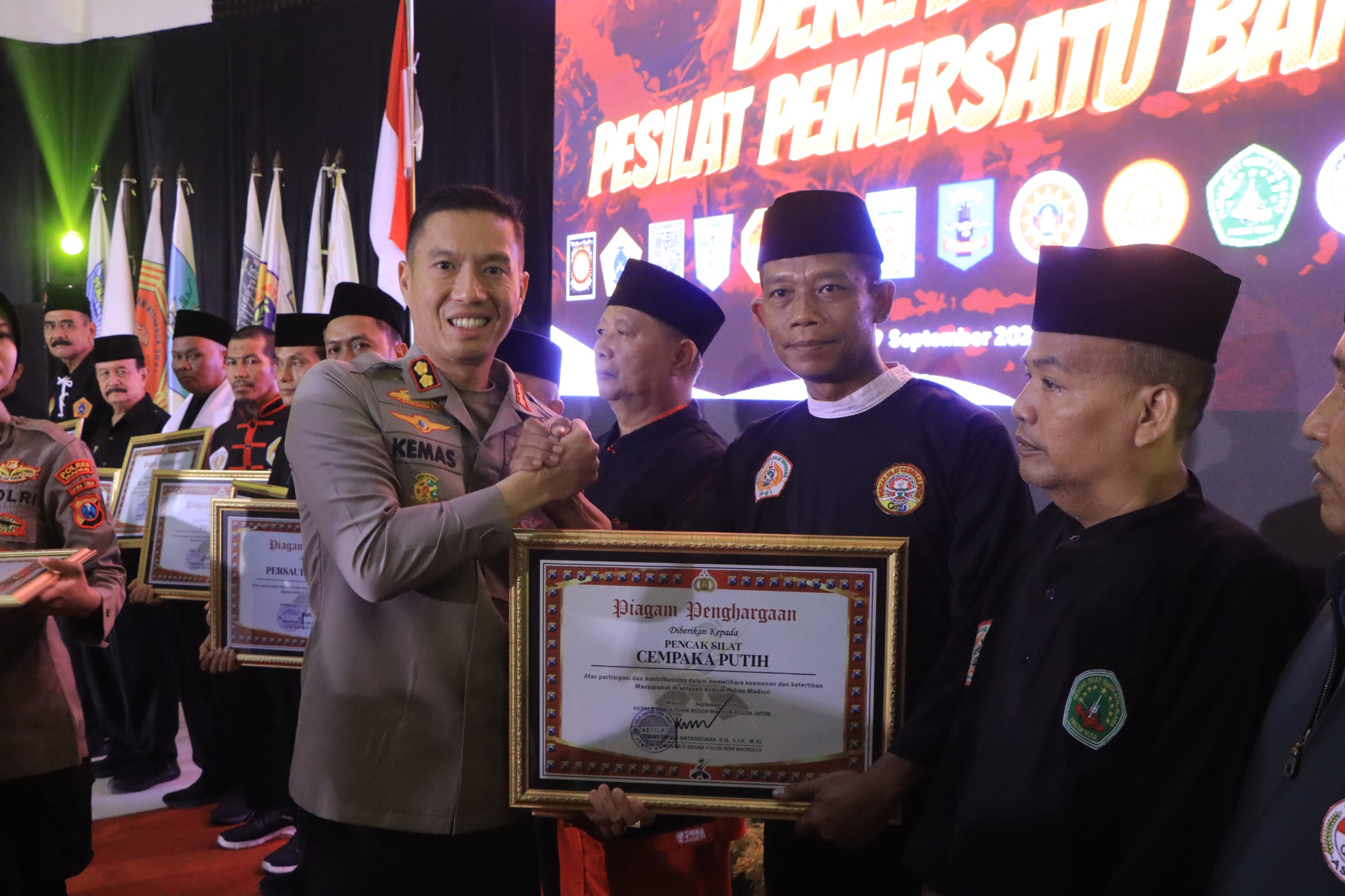 “Penghargaan ini adalah bukti bahwa kami dari kepolisian memberikan apresiasi setinggi-tingginya kepada perguruan silat yang telah berperan aktif dalam menjaga kondusifitas,” kata AKBP Kemas.