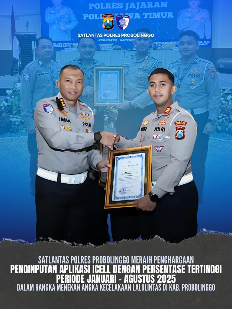 Kasatlantas Kabupaten Probolinggo, AKP Safiq Judhira Z.,S.Tr.K.,S.I.K.,M.Si.mencatat prestasi gemilang dengan meraih penghargaan dari Dirlantas Polda Jatim. Penghargaan ini merupakan pengakuan atas capaian luar biasa dalam menurunkan angka kecelakaan lalu lintas di Probolinggo hampir separuh sepanjang tahun 2025. Sebuah pencapaian yang tidak hanya membanggakan, tetapi juga menjadi kabar baik bagi keselamatan warga dan pengguna jalan di wilayah tersebut.(jumat 12/9)