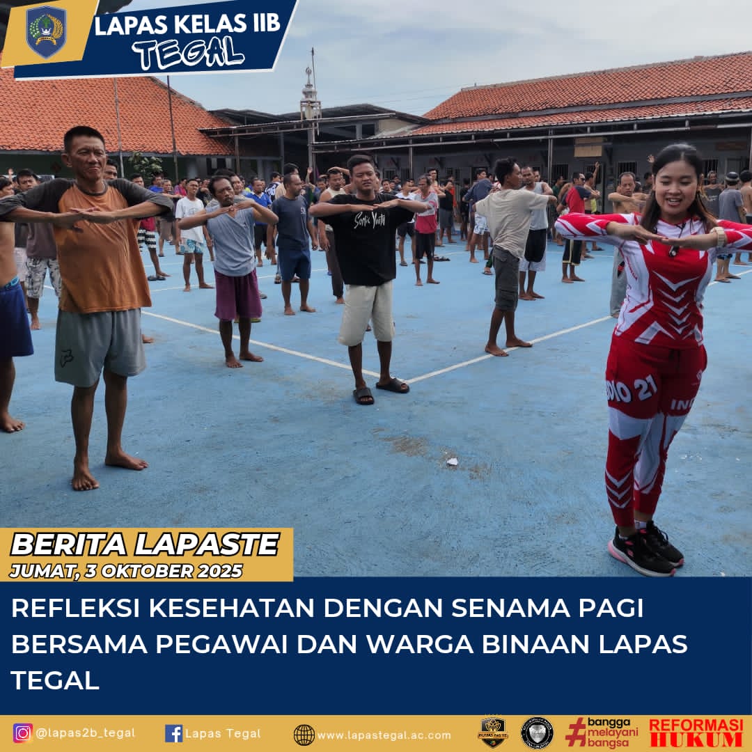 Tegal,Komposisinews.com – 3 Oktober 2025 – Lembaga Pemasyarakatan Kelas IIB Tegal kembali menggelar kegiatan senam pagi bersama yang diikuti oleh seluruh Warga Binaan Pemasyarakatan (WBP) dan juga pegawai Lapas Tegal. Kegiatan rutin yang bertujuan untuk menjaga kebugaran jasmani dan rohani ini dilaksanakan di lapangan blok hunian Lapas Tegal, dengan suasana penuh semangat di pagi yang cerah.