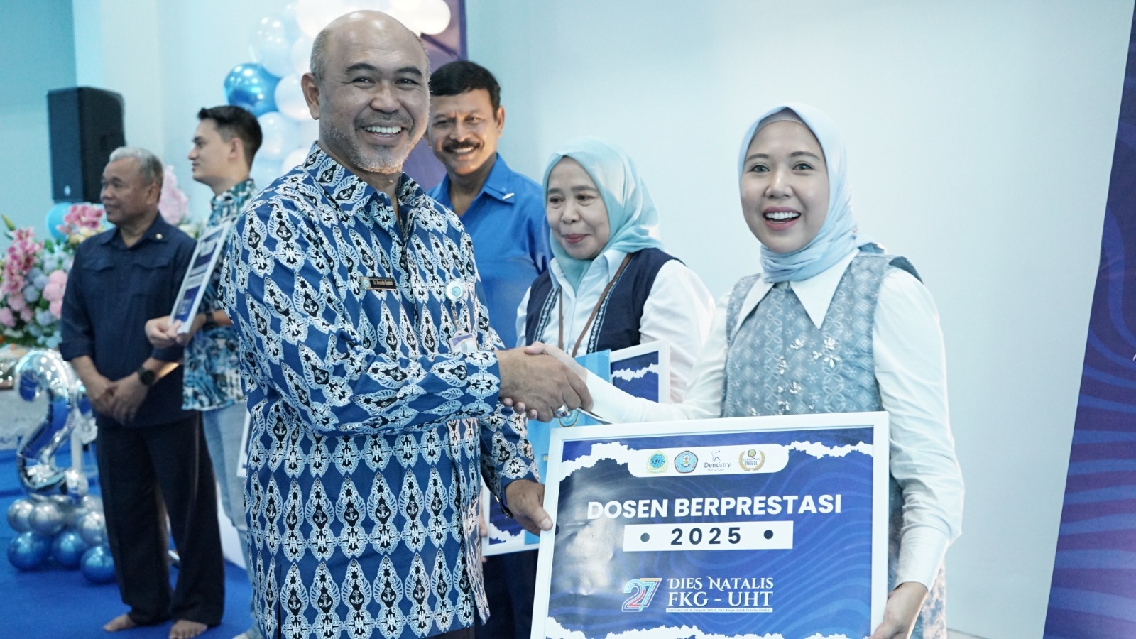 Sebelum acara dimulai, seluruh hadirin juga diajak mengheningkan cipta untuk mengenang Prof. Dr. Arifzan Razak, drg., M.Sc., Sp.Pros(K), salah satu guru besar senior FKG UHT yang berpulang pada usia 87 tahun.