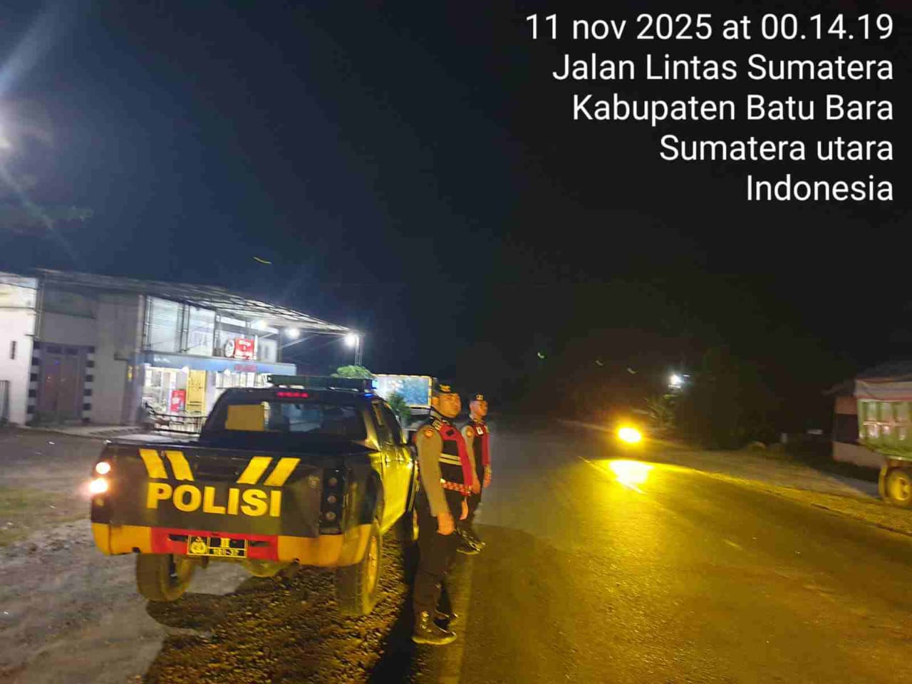 Pada hari Senin, 10 November 2025, mulai pukul 01.00 WIB, personel Polres Batu Bara yang terdiri dari Aipda Oky Hasibuan dan Bripda Ikhsan Aperi melaksanakan patroli “Blue Light” menggunakan 1 unit R-4 Sat Samapta Isuzu D-Max.