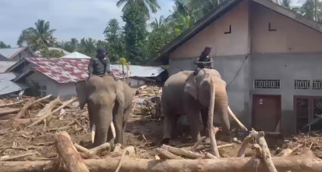 “Empat gajah yang kita datangkan bersama BKSDA Aceh hari ini sudah berada di lokasi. Mereka langsung kita kerahkan untuk menarik kayu-kayu besar serta material berat lainnya yang menumpuk akibat banjir,” ujar Iptu Fauzi.