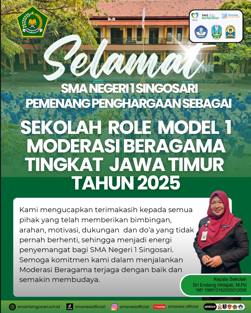 Malang,Komposisinews.com – Prestasi yang membanggakan kembali di Raih oleh SMAN 1 Singosari atau lebih dikenal dengan SMANESI yanti sebagai Role Model Sekolah Moderasi Beragama Tingkat Jawa Timur. Moderasi beragama di SMAN 1 Singosari merupakan upaya untuk meningkatkan toleransi dan kerukunan antar siswa yang memiliki latar belakang agama berbeda. Beberapa strategi yang dilakukan antara lain :