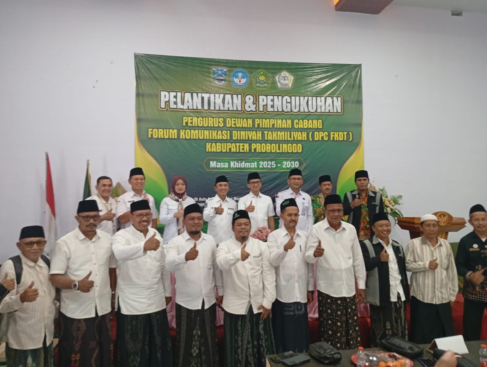 Pengurus Dewan Pimpinan Cabang Forum Komunikasi Diniyah Takmiliyah (DPC FKDT) Kabupaten Probolinggo masa khidmat 2025–2030 resmi dilantik dan dikukuhkan dalam sebuah acara yang berlangsung khidmat di Aula RM Masada Desa Karanggeger Kecamatan Pajarakan, Rabu (14/1/2026).