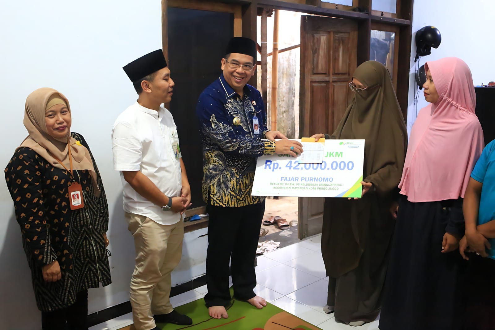 Probolingho,komposisinews.com-Jumat (13/3) sore, Wali Kota Probolinggo Dokter Aminuddin didampingi Kepala Disperinaker Retno Fajar Winarti dan Kepala BPJS Ketenagakerjaan Cabang Probolinggo Nurhadi Wijayanto menyerahkan santunan jaminan kematian dari BPJS Ketenagakerjaan kepada tiga keluarga warga yang telah meninggal dunia. Penyerahan santunan tersebut menjadi bentuk kepedulian pemerintah dalam memastikan perlindungan sosial bagi masyarakat pekerja di Kota Probolinggo.