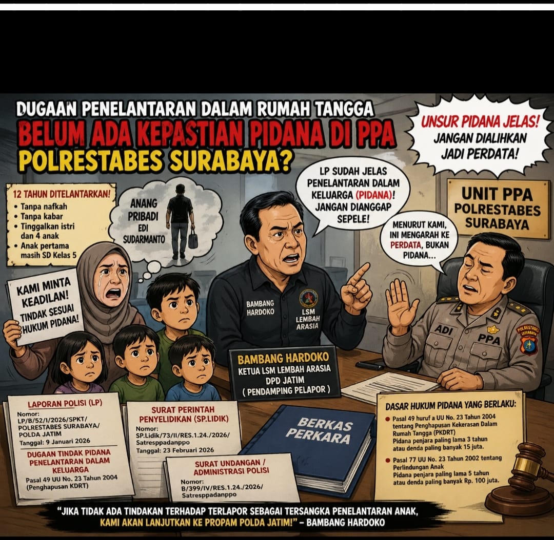 Surabaya,Komposisinews.com– Penanganan kasus dugaan penelantaran dalam rumah tangga di Unit Perlindungan Perempuan dan Anak (PPA) Polrestabes Surabaya menuai kritik tajam. Pelapor bersama pendamping dari LSM Lembah Arasia menyatakan ketidakpuasan atas belum adanya kepastian hukum pidana, meski laporan resmi kepolisian telah diterbitkan dan proses penyelidikan berjalan.